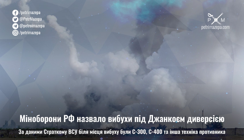 У міноборони країни-агресора причиною вибухів боєприпасів на тимчасовому складі під Джанкоєм назвали диверсію. Як уточнюють у Центрі стратегічних комунікацій (СтратКом) ЗСУ, біля місця вибухів рашисти зосередили близько 50 одиниць техніки, включаючи С-300 та С-400. Більшість ворог планував перекинути на окуповану материкову частину України.