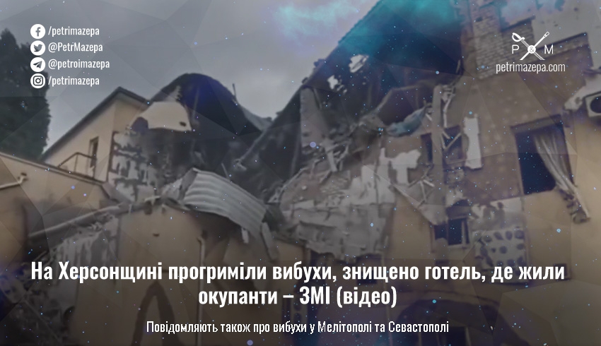 Місцеве видання «Мост» повідомило про потужні вибухи в окупованому Херсоні – за даними, які надали їм місцеві, було знищено заклад, де тривалий час жили окупанти та колаборанти. Також повідомляється про вибухи у окупованих Мелітополі й Севастополі.