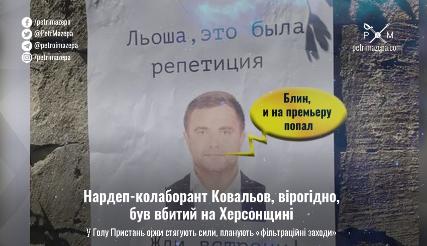 У власному Telegram-каналі Соболевський також підкреслив, що орки планують проводить у Голій Пристані, де скоріш за все і було вбито нардепа Ковальова, фільтраційні заходи, туди вже стягнули додаткові сили.