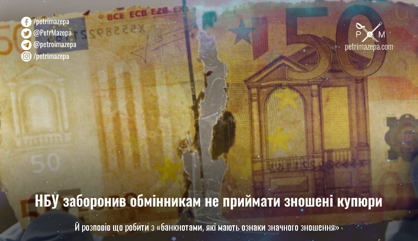 - з пошкодженими елементами дизайну та захисту (видалені цифрові чи текстові позначення номіналу, зображення портрета, оптично-змінні елементи захисту, захисні стрічки);