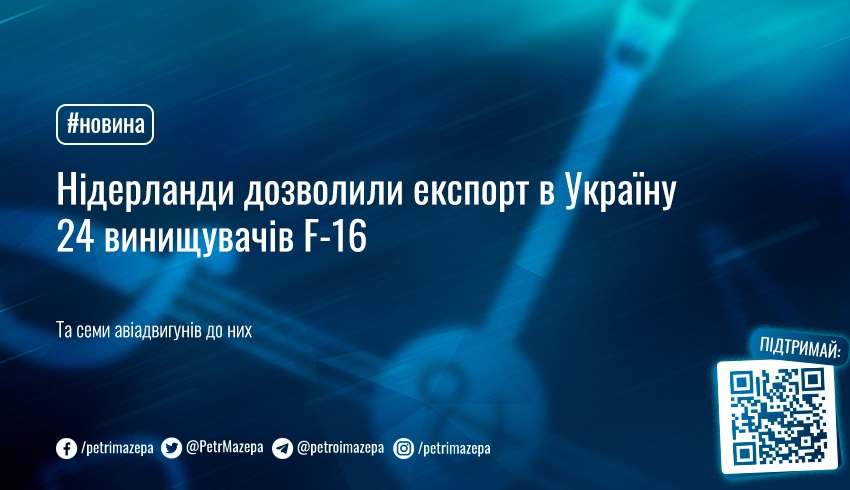 Нідерланди офіційно дозволили експорт в Україну 24 винищувачів F-16 і семи авіадвигунів до них.