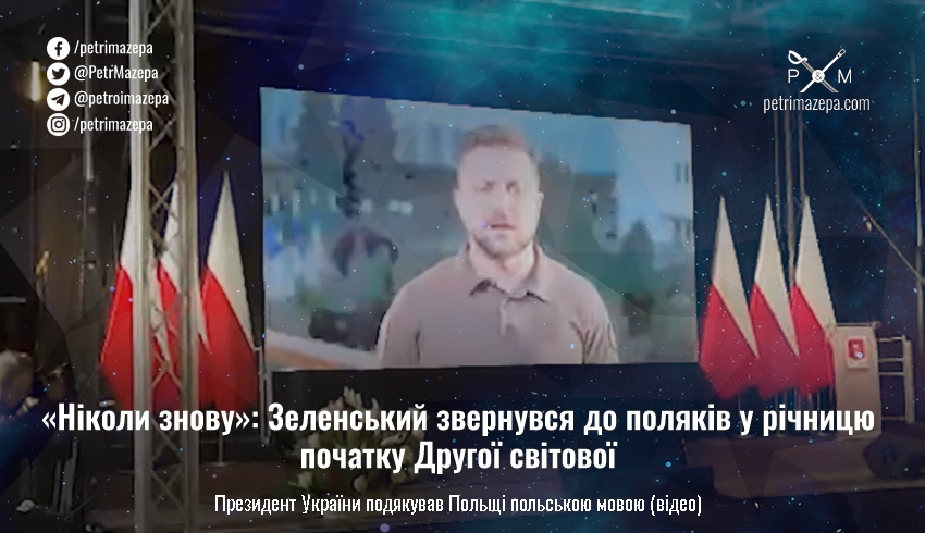 Президент України Володимир Зеленський записав звернення до поляків у річницю початку Другої світової, коли саме польські міста почали зазнавати бомбардувань. Він підкреслив, що Україна зробить усе, щоб ранок 1 вересня 1939 року, як і ранки 22 червня та 24 лютого ніколи не повторювались. Також наш президент висловив слова вдячності президенту Польщі Анджею Дуді та всьому польському народу польською мовою.