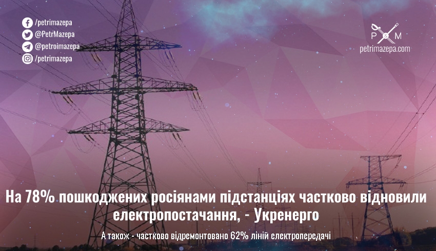 Повідомляється, що від 24 лютого енергетики частково відновили електропостачання на 78% пошкоджених російськими загарбниками високовольтних підстанцій та 62% лініях електропередач.