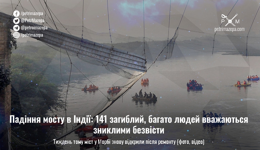 Щонайменше 141 людина загинула під час обвалення пішохідного підвісного мосту в західному індійському штаті Гуджарат. Багато людей вважаються зниклими безвісти. Серед загиблих багато жінок, дітей та людей похилого віку. Лише тиждень тому міст у Морбі знову відкрили після ремонту.