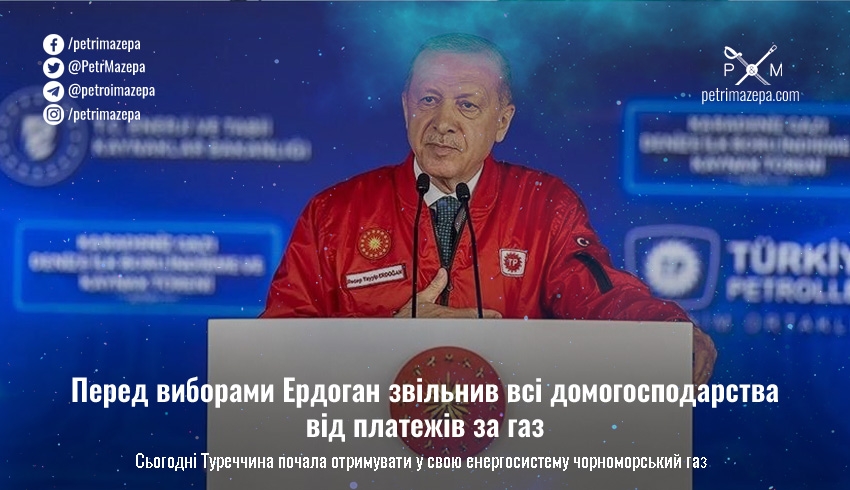 Президент Туреччини Реджеп Тайіп Ердоган виступив на церемонії початку надходження природного газу з родовищ Чорного моря до енергетичної системи Туреччини, де пообіцяв усім газ без оплати. Цілком випадково церемонія початку постачання пройшла менш ніж за місяць до президентських виборів.