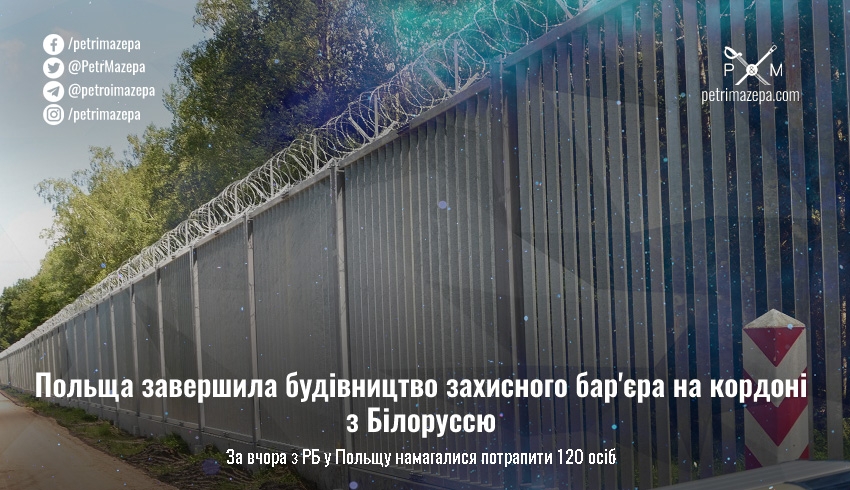 Про це повідомив уповноважений уряду Польщі з питань безпеки інформаційного простору Станіслав Жарин у Twitter. Висота захисного бар’єра — 5,5 метрів, а саме огородження зроблено зі сталевих панелей заввишки 4,5 м із колючим дротом нагорі.