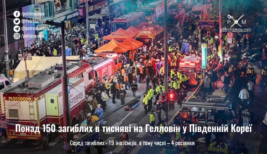 В столиці Південної Кореї Сеулі під час штовханини у ніч святкування Геловіну щонайменше 151 людина загинула і ще 100 отримали поранення. За останніми даними, серед загиблих 19 іноземців. Відомо, що серед них є громадяни Ірану, Узбекистану, Китаю, Норвегії, а також 4 росіянки. Даних про загиблих чи постраждали українців поки не надходило.