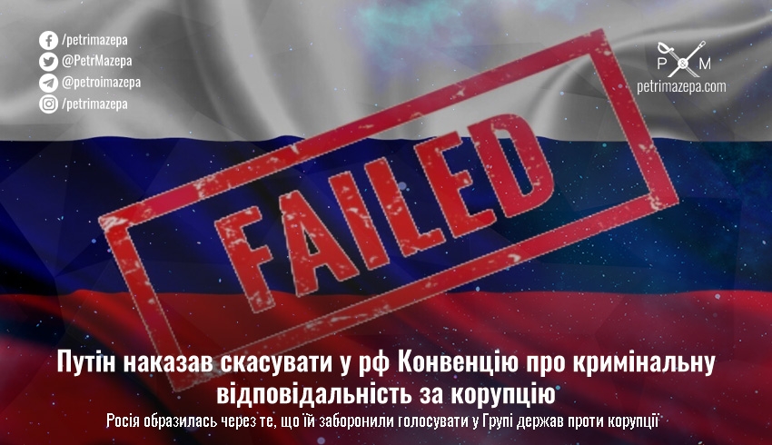 Диктатор росії вніс у підконтрольну йому Держдуму законопроєкт про денонсацію у рф Конвенції про кримінальну відповідальність за корупцію. Офіційно - через те, що росії заборонили голосувати та обговорювати ініціативи у Групі держав проти корупції.