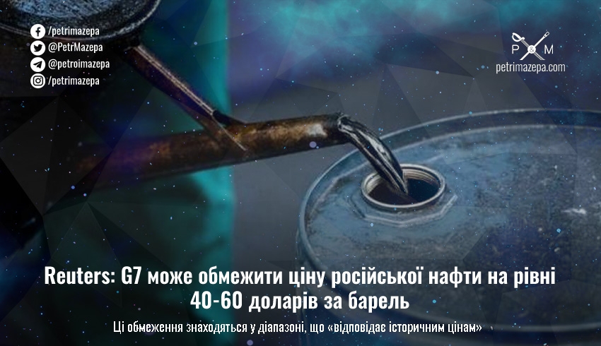 Країни G7 конкретизували свою ідею про стелю вартості російської нафти. Посилаючись на «історичні ціни», називають найбільш імовірним коридором 40-60 доларів за барель.