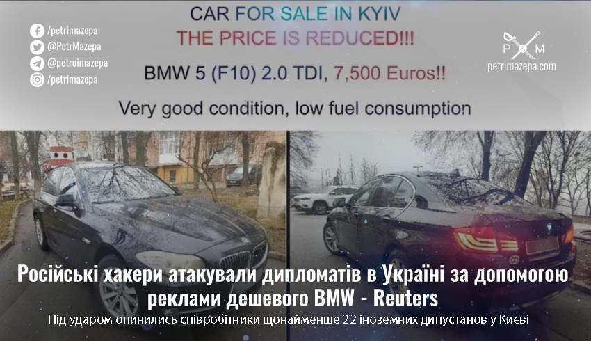 Російські хакери атакували дипломатів в Україні за допомогою реклами дешевого BMW - Reuters