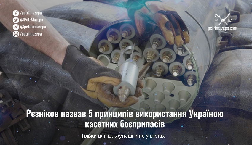 Міністр оборони Олексій Рєзніков повідомив про 5 принципів, згідно з якими Україна буде використовувати передані США касетні боєприпаси. В тому числі наша країна не буде використовувати їх на території росії, у містах та буде вести суворий облік усіх місць, де такі снаряди будуть використовуватись.