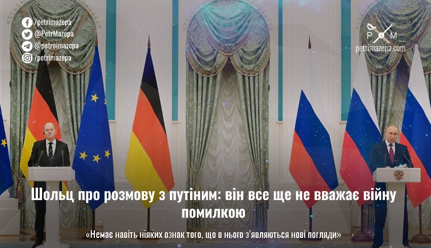 «На жаль, я не можу сказати вам що там з’явилось усвідомлення того, що починати цю війну було помилкою», — сказав Шольц у Берліні за результатами своїх нещодавніх перемовин з путіним, — «немає ніяких ознак того, що там з’являються нові погляди».