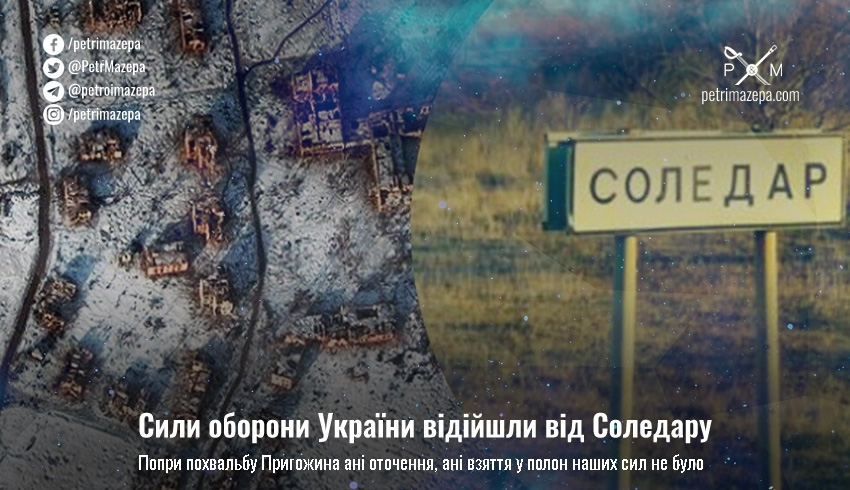 Сили оборони України відійшли від Соледара, повідомив «Суспільному» речник Східного угруповання військ ЗСУ Сергій Череватий. Оточення чи взяття в полон наших військ не було, ворогу не дали системно прорвати оборону й вийти в тил до захисників України.