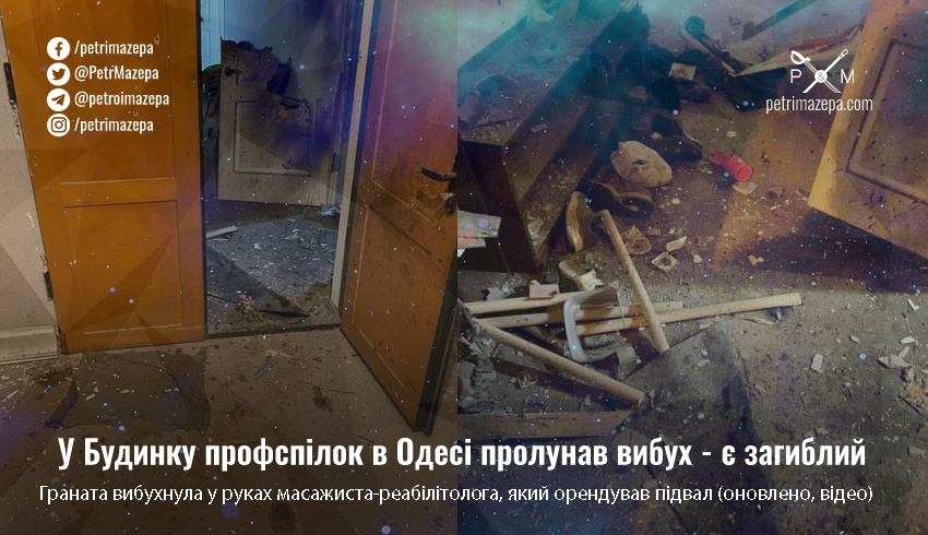 Поліція Одещини попередньо встановила, що унаслідок необережного поводження граната вибухнула в руках масажиста-реабілітолога, який орендував підвальне приміщення Будинку профспілок. Його пацієнт отримав легку баротравму.