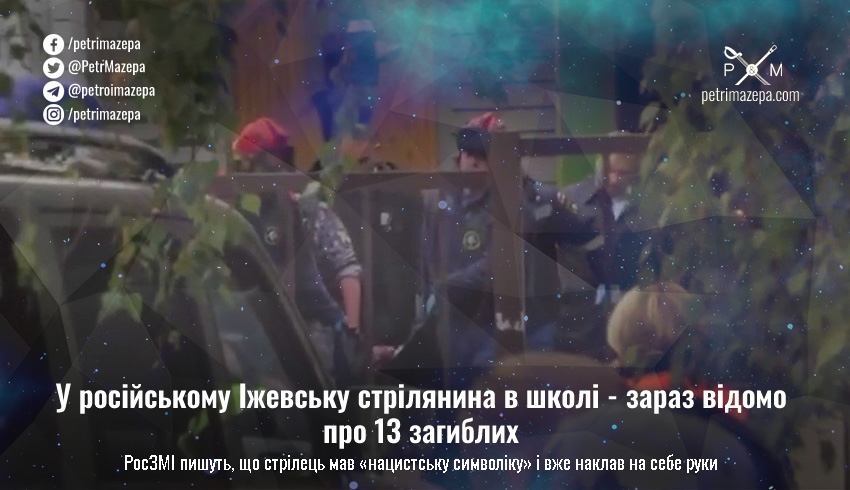 В Удмуртії невідомий чоловік увійшов до школи №88 Іжевська та вчинив стрілянину. На цей час відомо про 13 загиблих. Також повідомляється про два десятки поранених.