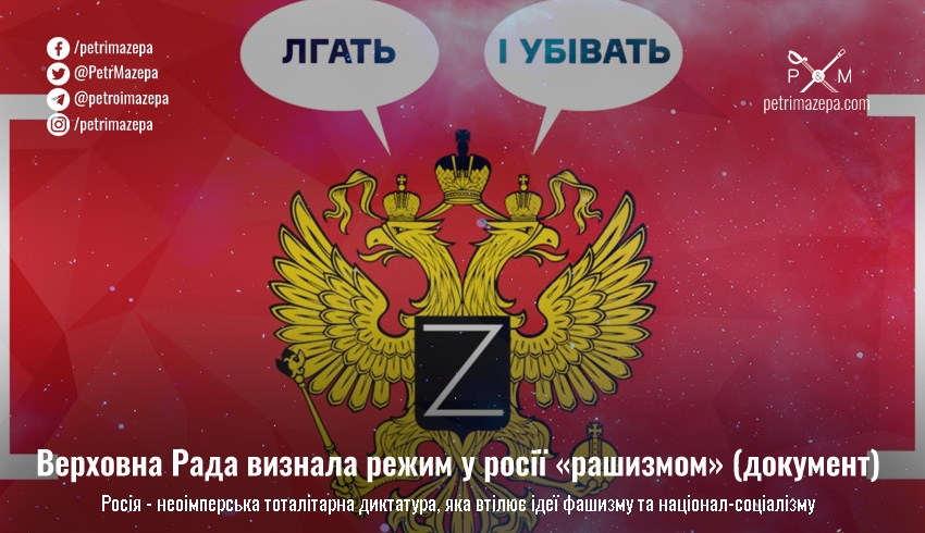 Верховна Рада України ухвалила постанову, якою визнала режим у росії рашизмом — тепер країна-агресор визнається тоталітарною неоімперською диктатурою із сучасною версією фашизму на офіційному рівні.