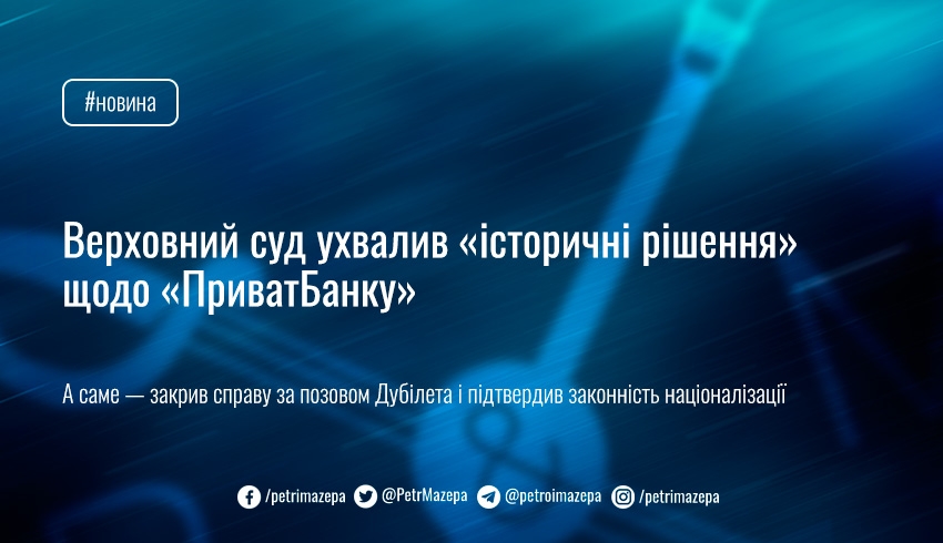 «Велика палата Верховного суду ухвалила історичне рішення у справі за позовом Олександра Дубілета, яке унеможливлює повернення націоналізованого у 2016 році "ПриватБанку" його колишнім власникам», — зазначає «Приват».
