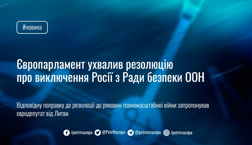 «Пропоную доповнити резолюцію та внести до неї наступний текст: "Європейський парламент… закликає ЄС та його країни-члени здійснити подальші дії щодо продовження міжнародної ізоляції Росії, включаючи членство у міжнародних організаціях, таких як Рада безпеки Організації Об'єднаних Націй"», — заявив депутат.