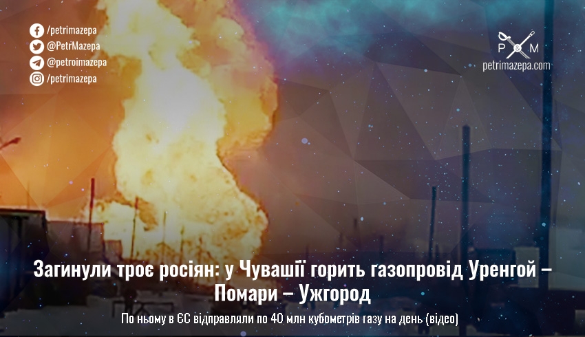 У російській Чувашії між селами Кюльхірі та Калініно Вурнарського району через вибух горить газопровід. Пожежа сталася на газопроводі «Уренгой – Помари – Ужгород», який входить в Україну через ГІС «Суджа» – єдине місце, через яке досі йде транзит газу.
