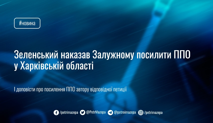 «Ураховуючи, що протиповітряна оборона міста Харкова та Харківської області здійснюється у загальній системі протиповітряної оборони України, я доручив головнокомандувачу Збройних сил України Валерію Залужному, на якого покладено відповідальність за її організацію та керівництво, розглянути порушене в електронній петиції питання і про результати розгляду поінформувати її автора», — йдеться у відповіді Зеленського, опублікованій Офісом президента.