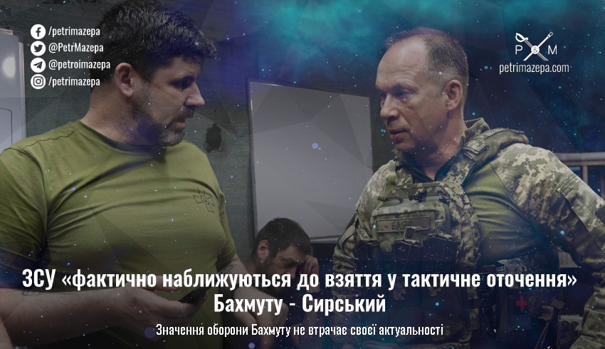 «Ми продовжуємо просуватись по флангах у передмісті Бахмута і фактично наближаємося до взяття міста у тактичне оточення. Завдяки цьому ми зможемо контролювати всі висотні будівлі, зайняті ворогом, і поступово їх знищувати. Це позбавляє ворога контролю за підступами до міста і дає нам певні тактичні переваги», — цитує Сирського Military Media Center.