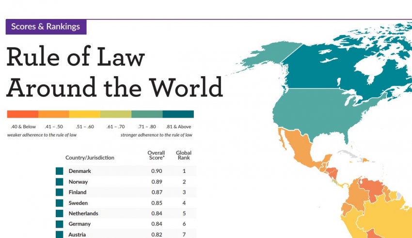 Индекс верховенства права отражает обеспечение законности в стране и рассчитывается с учетом состояния правительственных полномочий, уровня коррупции, открытости правительства, фундаментального характера права, обеспечение порядка и безопасности, гражданского и уголовного правосудия.