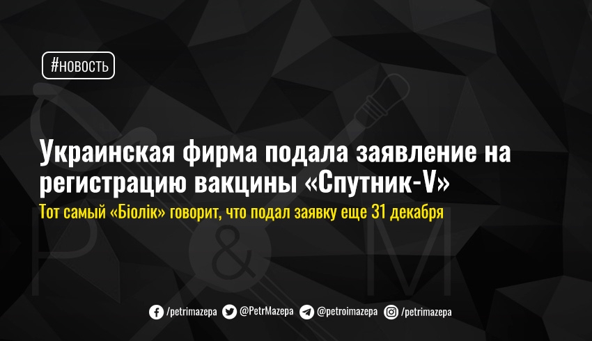 «В связи с многочисленными запросами администрация АО «Біолік» сообщает, что 31.12.2020 г. в адрес МЗ Украины нами действительно было отправлено заявление о государственной регистрации лекарственного средства - вакцины «Гам-КОВИД-Вак», комбинированной векторной вакцины для профилактики коронавирусной инфекции, вызванной вирусом SARS-CoV-2, производства ФДБУ НИЦЭМ им. М.Ф. Гамалеи», - заявляет компания на сайте.