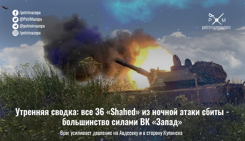 На Авдеевском — враг за сутки потерял 3 танка. А в целом по фронту враг усиливает давление на Авдеевку и в сторону Купянска, при этом пытается не потерять инициативу в Марьинке и Бахмуте.