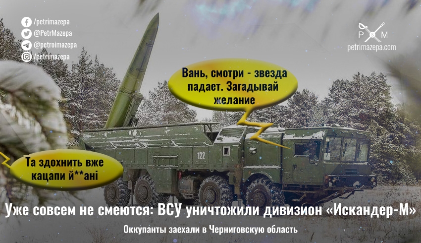 «На черниговском направлении одно из подразделений оперативного командования "Север" уничтожило дивизион "Искандер-М", которые обстреливали мирное население», - сообщает 10 марта пресс-служба ОК «Север».