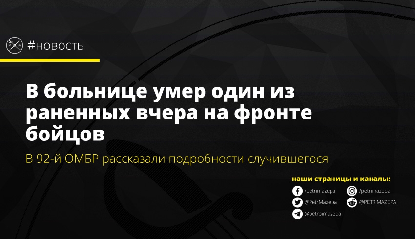Вчера под обстрел со стороны бандформирований российских оккупантов попали бойцы 92-й ОМБР им. кошевого атамана Ивана Сирко. Один из них погиб на месте, а еще трое получили ранения различной степени тяжести. К сожалению, сегодня стало известно, что один из раненных умер в больнице.