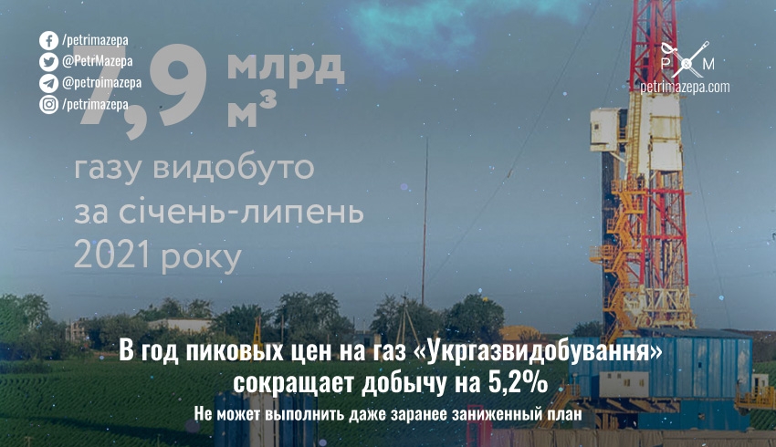 АО «Укргазвидобування» в январе-июля 2021 года сократило добычу природного газа по сравнению с аналогичным периодом прошлого года на 5,2% (0,437 млрд кубометров) до уровня 7,9 млрд кубометров. Отклонение от производственного плана составляет минус 1,6% (0,125 млрд кубометров газа).