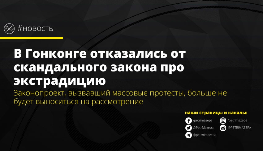 Премьер-министр Гонконга Кэрри Лэм заявила о полном отказе от законопроекта об экстрадиции. Он больше не будет вноситься на рассмотрение в Законодательный совет. Ранее она также лично извинилась перед активистами за противоречия в документе, но осудила насилие демонстрантов, и выразила надежду, что порядок вскоре будет восстановлен.