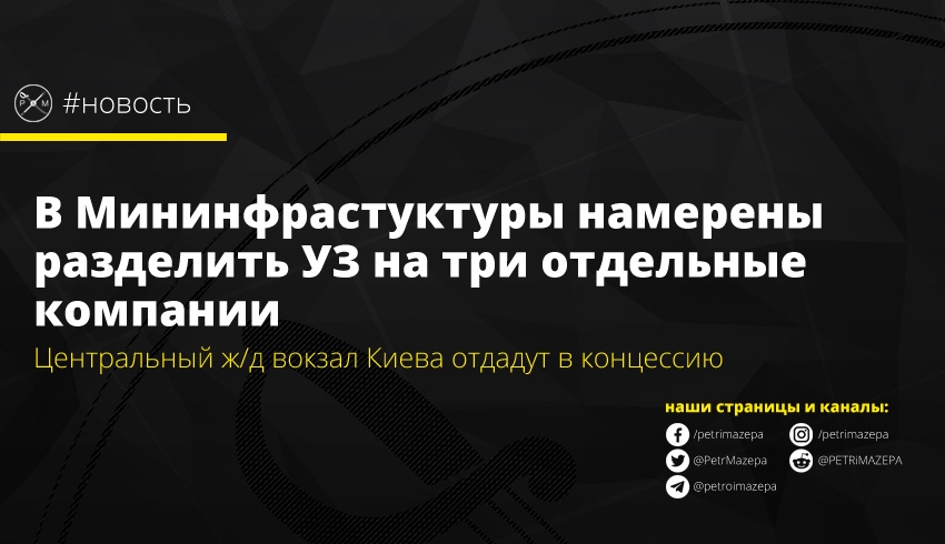 Министерство инфраструктуры планирует разделить «Укрзалізницю» (УЗ) на три компании, каждая из которых будет заниматься своим направлением. Также стало известно, что в концессию планируют передать железнодорожный вокзал Киева. А пока занимаются поиском производителя экскалаторов который на условиях финансового лизинга решит проблему с экскалатором на обозначенном вокзале.