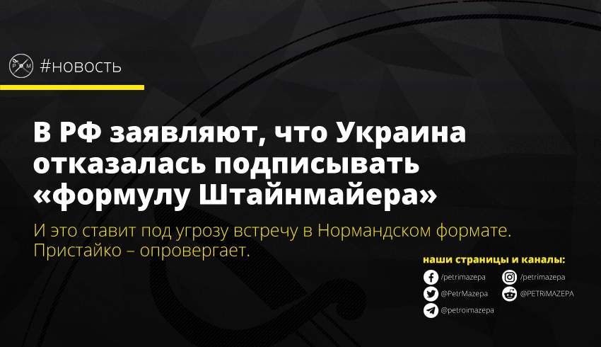 По следам этой новости, так и не получившей официального подтверждения, «Интерфакс» выпускает еще одну, про то, что отказа подписывать «формулу Штайнмайера» ставит под угрозу предстоящий саммит глав государств «нормандского формата». Где выставляет украинскую сторону «как ненадежного и безответственного партнера», перекладывая ответственность за срыв саммит со своего МИД на Украину. Ведь сами россияне в медийном поле крутят «формулу Штайнмайера» как им удобно и до сих пор неизвестно, что именно они внесли в составляющие своего видения этой формулы в Минске.