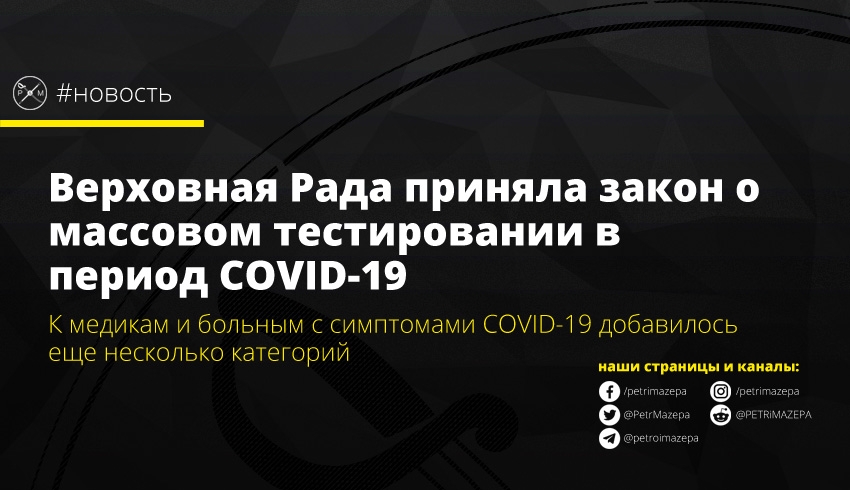 На внеочередном заседании Верховная Рада приняла законопроект, который расширяет перечень категорий людей, попадающих под массовое тестирование на COVID-19. Также эти изменения в некоторые законы Украины позволят улучшить условия труда медперсонала.