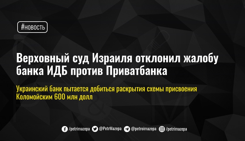 «Своим решением Верховный суд Израиля оставил без изменений решение Окружного суда, согласно которому иск ПриватБанка в ИБД должен рассматриваться в полном объеме и не должен быть отклонен или остановлен, вопреки тому, что требовал ИБД», - цитирует «Укринформ» пресс-релиз банка.
