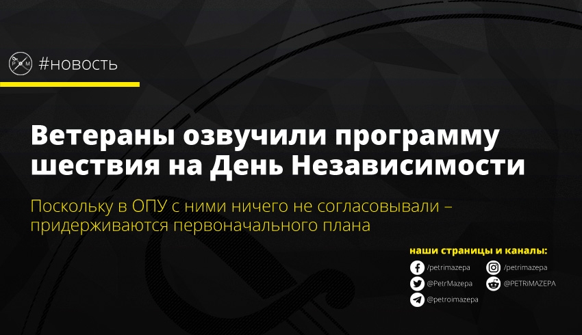 - На выходных Офис президента Украины опубликовал официальный список мероприятий ко Дню независимости, в которых главным мероприятием станут удары колокола, а также назначено время проведения торжественного праздничного шествия и Марша защитников Украины при участии ветеранов. Ветераны сообщили, что с ними никто время проведения не согласовывал, и обещали провести в понедельник пресс-конференцию, чтобы обнародовать свои планы.