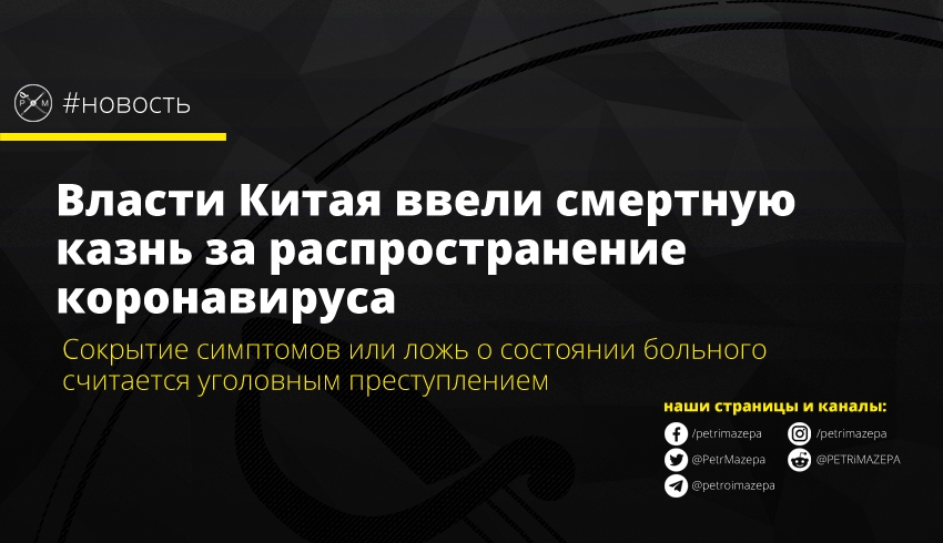 Китайские власти ввели уголовное преследование за распространение COVID-19. Человек, который стал источником инфекции и привел к распространению коронавируса, теперь будет обвинен в создании угрозы общественной безопасности, за что предусмотрено наказание вплоть до смертной казни.