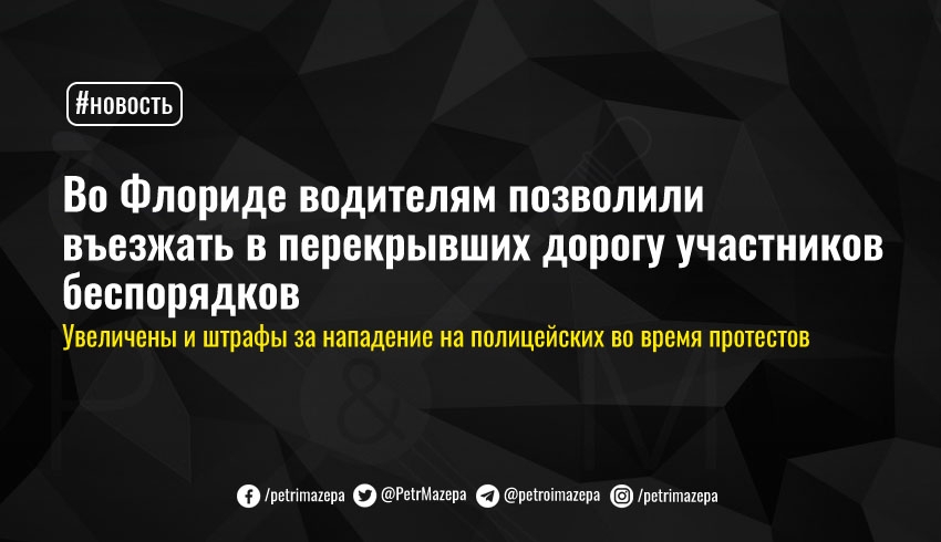Губернатор Флориды подписал закон о борьбе с массовыми беспорядками, направленный на подавление протестов, переходящих в насилие. По новому закону водителям, въезжающим в перекрывших дорогу участников массовых беспорядков, будет предоставлен гражданский иммунитет, а участники беспорядков не смогут покинуть тюрьму до своей первой явки в суд.