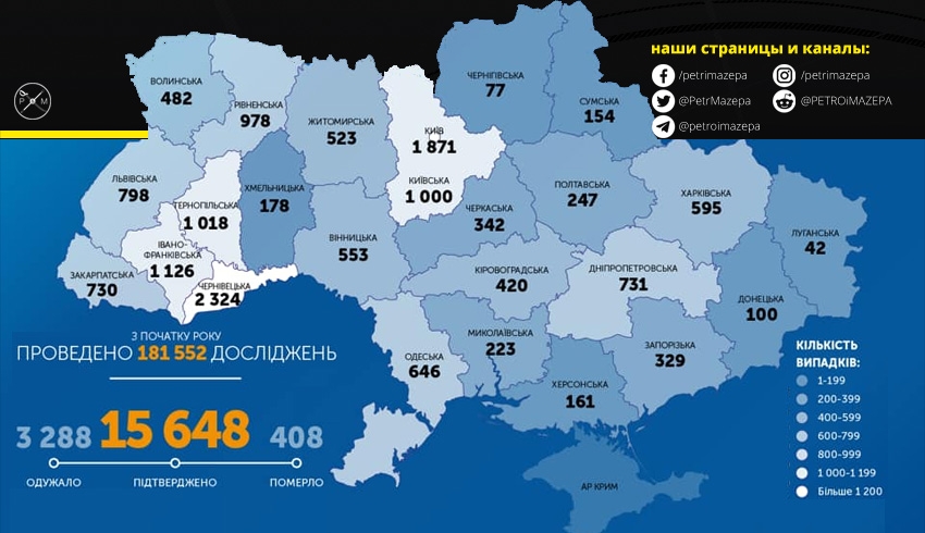 Всего в Украине подтверждено 15648 случаев COVID-19, из них 416 за последние сутки. В результате осложнений, вызванных болезнью, умерли 408 человек (+17 за сутки), а количество выздоровевших пациентов увеличилось до 3288 человек (+228 за сутки).
