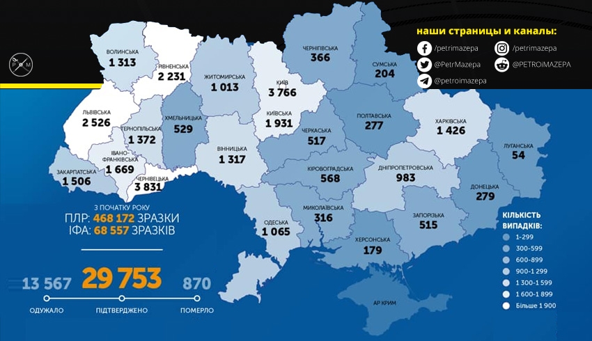 В Украине подтверждено 29753 случая COVID-19, из них 13 464 выздоровели (+426 за последние сутки), 870 умерли (+16). За последние сутки лабораторно подтверждено 683 случаев. Всего исследованы методом ПЦР 468 172 образцов (+11701) и 68557 образцов - методом ИФА (+8472).