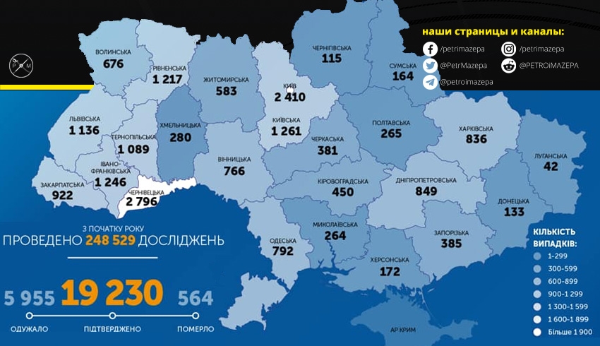Всего в Украине подтверждено 19230 случаев COVID-19, из них 5955 выздоровели (+323 за сутки), 564 умерли (+16 за сутки). За последние сутки лабораторно подтверждено 354 случая. Всего в Украине исследовано 248 529 образцов методом ПЦР, в том числе 8568 тестов проведено вчера.