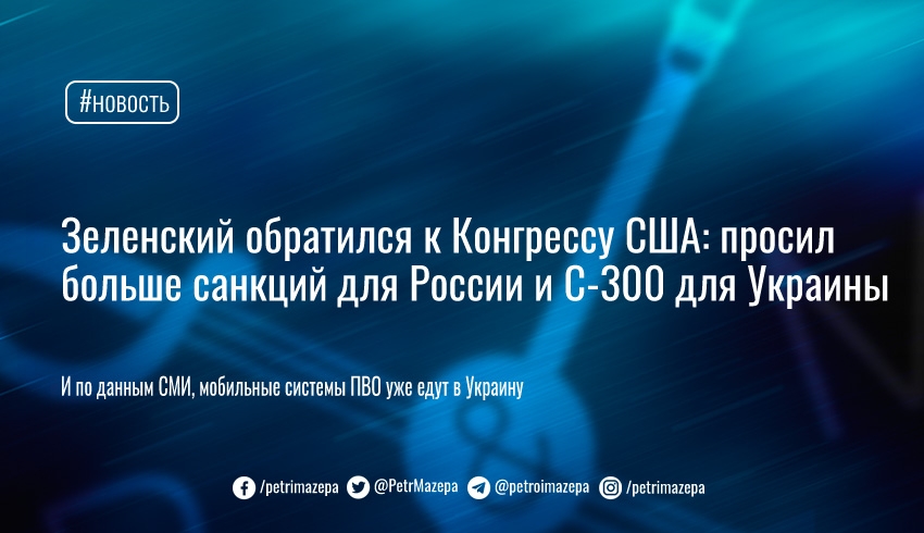 «Нам нужны оборонительные системы С-300 и другие. Вы знаете, как много зависит на поле боя от возможности использовать самолеты. Мощная авиация поможет защитить наш народ, нашу свободу и нашу землю. Самолеты помогут нам защитить Украину и Европу. У вас есть они. Но они находятся на земле, а не в украинском небе», - сказал Зеленский.