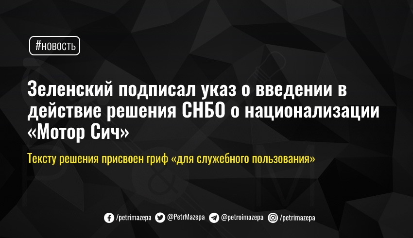 Указ опубликован на сайте Офиса президента. Текст самого решения СНБО от 11 марта не опубликован - ему присвоен гриф «для служебного пользования». Секретаря СНБО Алексей Данилов в тот день заявлял, что согласно принятому решению, предприятие «Мотор Сич» будет возвращено украинскому народу. «Будет возвращено в собственность украинского государства законным, конституционным способом в ближайшее время», - сказал Данилов, на котрого возложен контроль за исполнением решения.