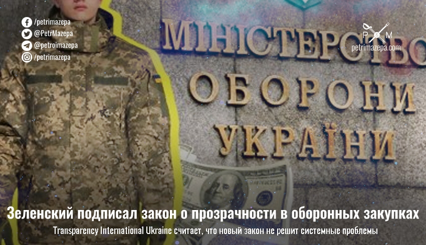 Президент Владимир Зеленский подписал законопроект «Об оборонных закупках» о введении прозрачности в оборонных закупках. Этот законопроект поддерживают в DOZORRO и Transparency International Ukraine, но там считают, что системных проблем он не решит.