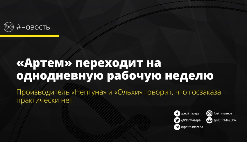 «На сегодняшний день у нас нет больших действующих контрактов по государственному оборонному заказу, которые могли бы загрузить наши производственные мощности, хотя мы освоили и готовы поставлять для МОУ такие необходимые изделия, как снаряд 152-мм, снаряд ОФ29 и РС-80. С первого квартала 2021 «Артем» вынужденно переводит около 70% работников на однодневный рабочую неделю. Это 1200 человек. Работать полный неделю останется только ядро с 500-600 специалистов. Они будут выполнять имеющиеся контракты, в том числе экспортные, которые еще держат предприятие «на плаву», - сообщил Зимин.
