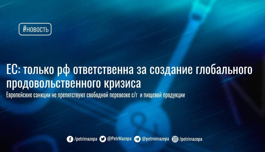 Лидеры Европейского Союза считают, что только россия ответственна за создание глобального продовольственного кризиса. В заявлении лидеров ЕС говорится, что европейские санкции против россии не препятствуют свободной перевозке сельскохозяйственной и пищевой продукции, а также доставке гуманитарной помощи.