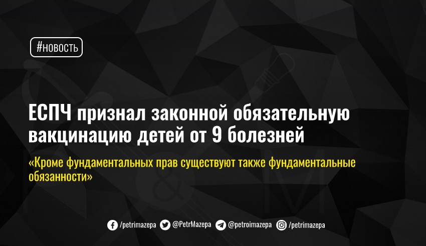 «Первое постановление Европейского суда по правам человека о обязательной вакцинации детей не выявлено нарушения Конвенции о защите прав человека», - сообщается в официальном Twitter ЕСПЧ.
