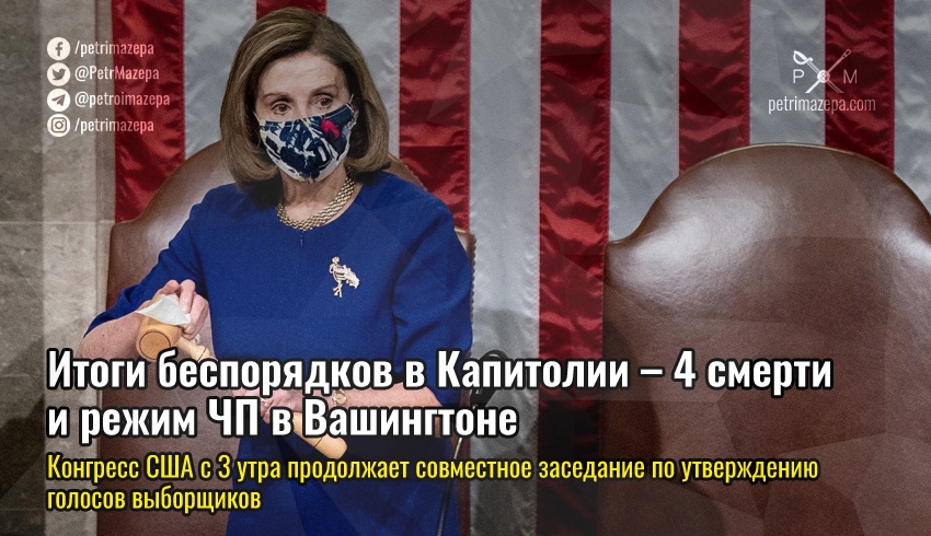 Сегодня ночью полиция Капитолия США сообщила, что угроза безопасности устранена для всех зданий в комплексе после массовых беспорядков. Мэр Вашингтона Мюриэл Боузер ввела режим чрезвычайного положения в Вашингтоне и почти сразу продлила его до окончания инаугурации - на 15 дней. Члены Конгресса вернулись в Капитолий и с 3 утра по киевскому времени продолжили принимать голоса выборщиков по каждому штату отдельно.