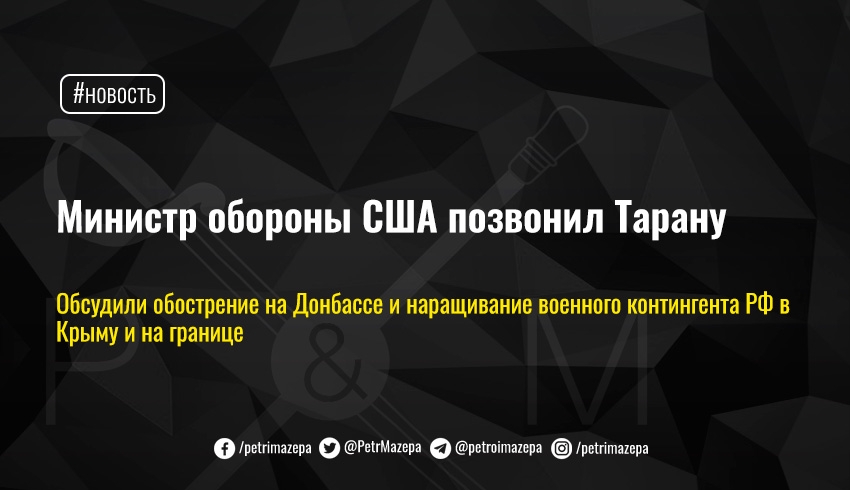 Сегодня, 1 апреля, по инициативе американской стороны состоялся телефонный разговор министра обороны Украины Андрея Тарана с американским коллегой Ллойдом Остином.